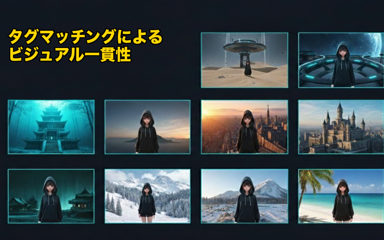 タグを使用してリファレンスとシーンをマッチングし、キャラクターとスタイルを精密に制御。