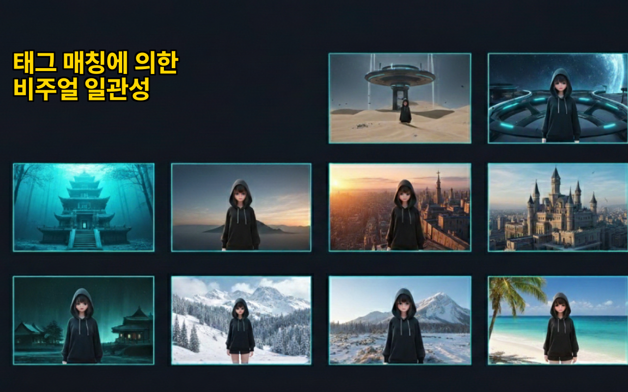 태그를 사용하여 레퍼런스와 씬을 매칭하고 캐릭터와 스타일을 정밀하게 제어합니다.